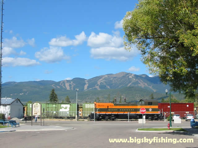 Another picture of the old Great Northern train engine in Whitefish, with Big Mountain ski area looming in the background.