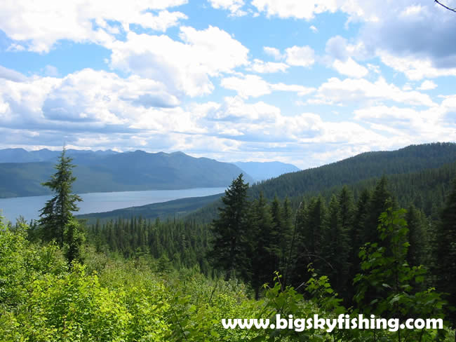 This is another photograph of Lake McDonald as seen from the Trout Lake Trail. There aren't too many viewing points of the lake on the trail, since the Trout Lake Trail passes through moderately thick forests - although much of the undergrowth was burned during the 2003 Robert Fire. It should also be noted that the forests you see on the front side of the lake that run down the ridge (named "Howe Ridge"), were completely burned over, trees and all. As such, the view you get from this point (which is an avalanche corridor), will be quite a bit different today.