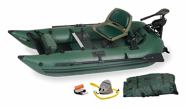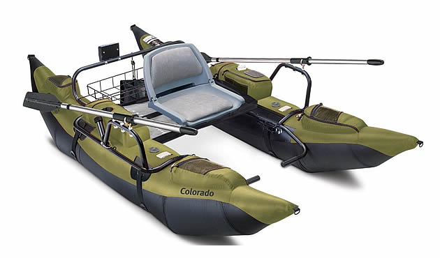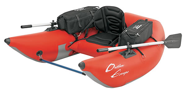 An Outlaw Frameless Pontoon Boat, which is also backpackable. This style of pontoon boat is ideal for solo anglers, and is simple to assemble and transport.